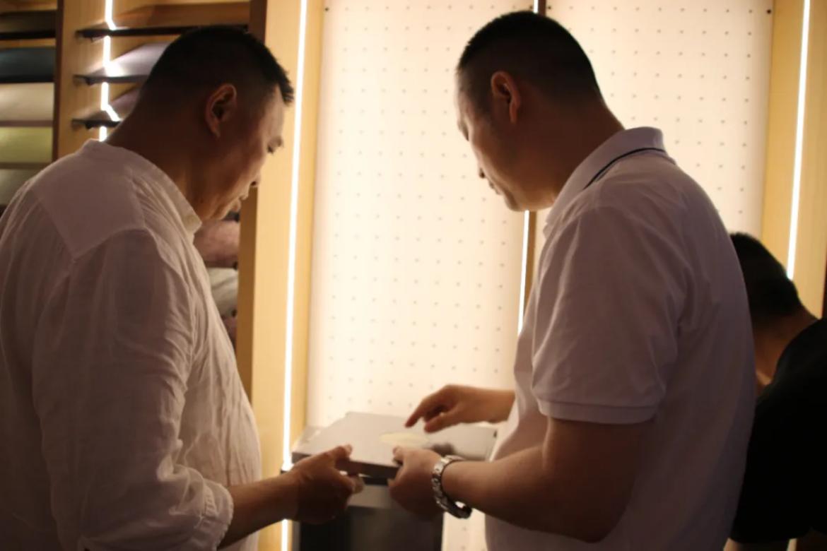 在簡單的致辭過后,庫靈圖家裝事業(yè)部總監(jiān)陳卓高先生開始帶領(lǐng)著大家詳細的參觀庫靈圖展廳內(nèi)的產(chǎn)品和工藝細節(jié)。而展廳內(nèi)靈動多變的產(chǎn)品工藝設(shè)計和多功能的交流空間,讓設(shè)計師們一眼便被紛紛吸引了。